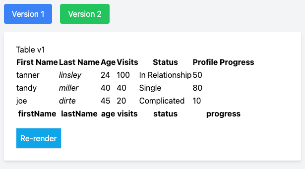 I've created a relatively straightforward way of viewing different table versions within this demo. You can see this in the App.tsx file. A couple of buttons allow you to switch between table versions.