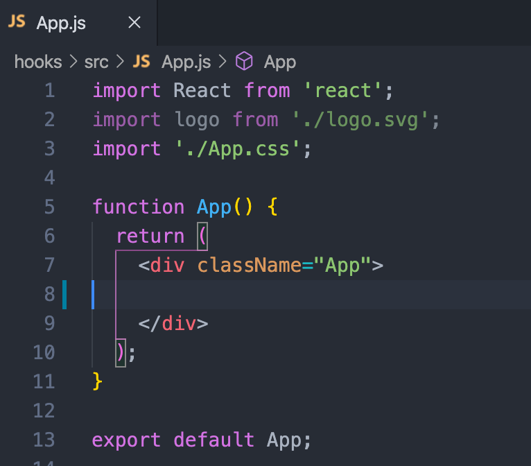 Let's edit the App.js file and remove all of the boilerplate. Meaning let's cut out everything between the header tag