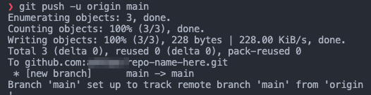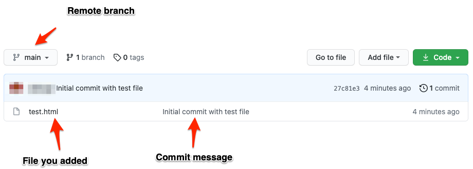 git push -u origin mainThis will push your test file with the commit message up to your remote repo on the main branch.